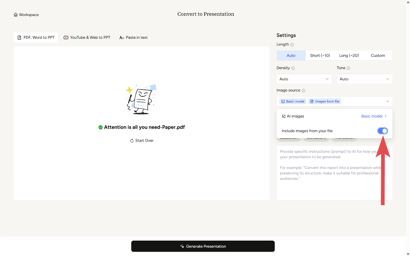 Alihkan opsi ini aktif untuk secara otomatis mengekstrak dan memasukkan gambar dari berkas dokumen yang Anda unggah. Ketika Anda mengunggah dokumen yang berisi diagram, grafik, atau gambar, sistem akan secara cerdas menyertakan visual asli tersebut dalam slide yang dihasilkan. Ini mempertahankan visualisasi data penting, diagram, dan grafik penting lainnya dari bahan sumber Anda, memastikan akurasi dan menghemat Anda dari merekonstruksi visual yang kompleks.