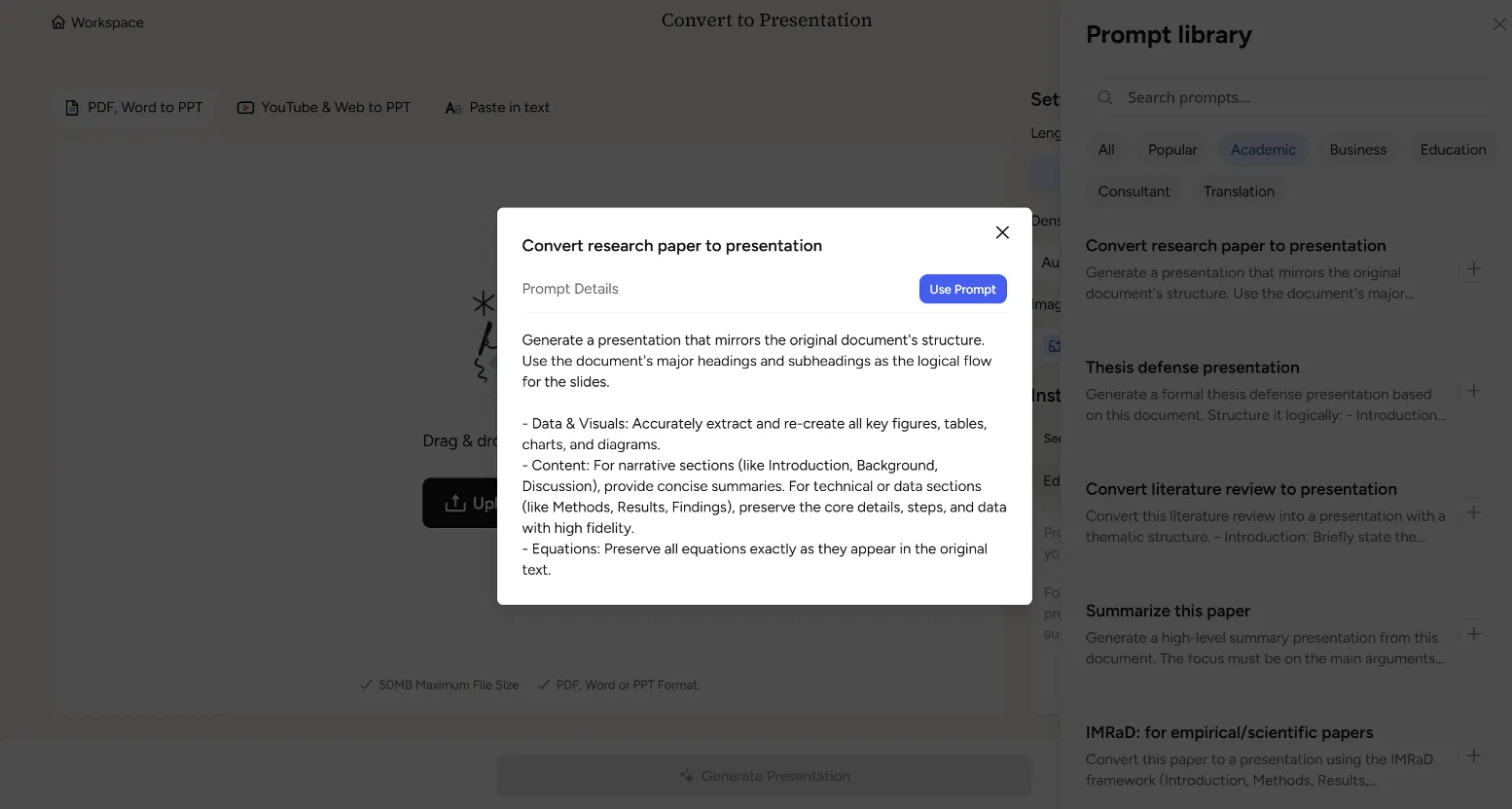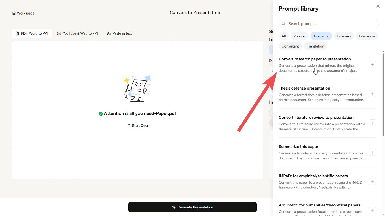 Klik teks di bawah prompt berjudul **Ubah makalah penelitian menjadi presentasi**.