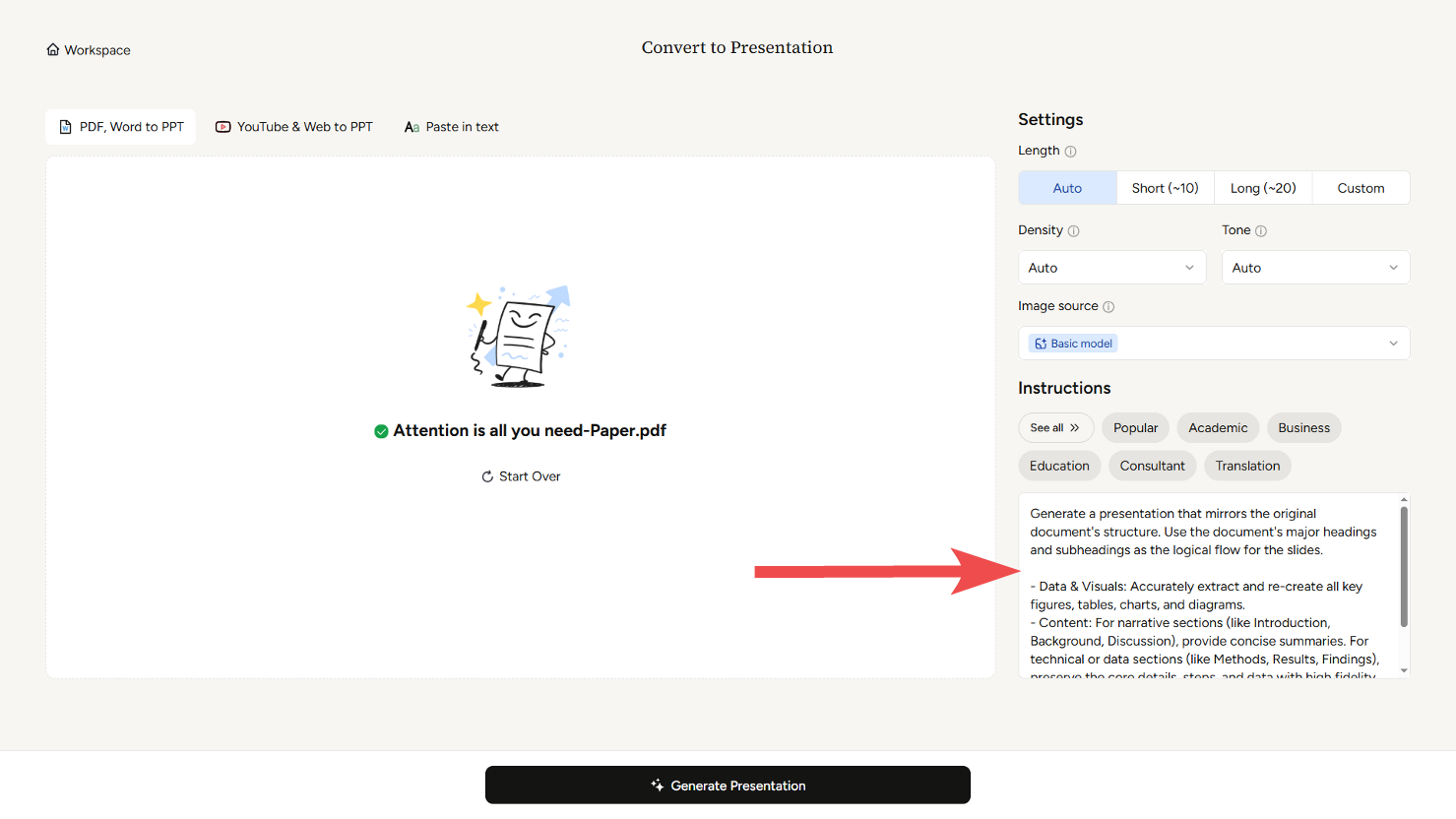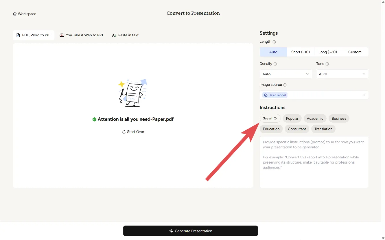 Di sisi kanan halaman, Anda akan menemukan panel **Pengaturan** dan **Instruksi** , yang memungkinkan Anda menyesuaikan bagaimana presentasi Anda dihasilkan. Opsi-opsi ini mengatur gaya, tingkat detail, dan nuansa keseluruhan slide Anda.